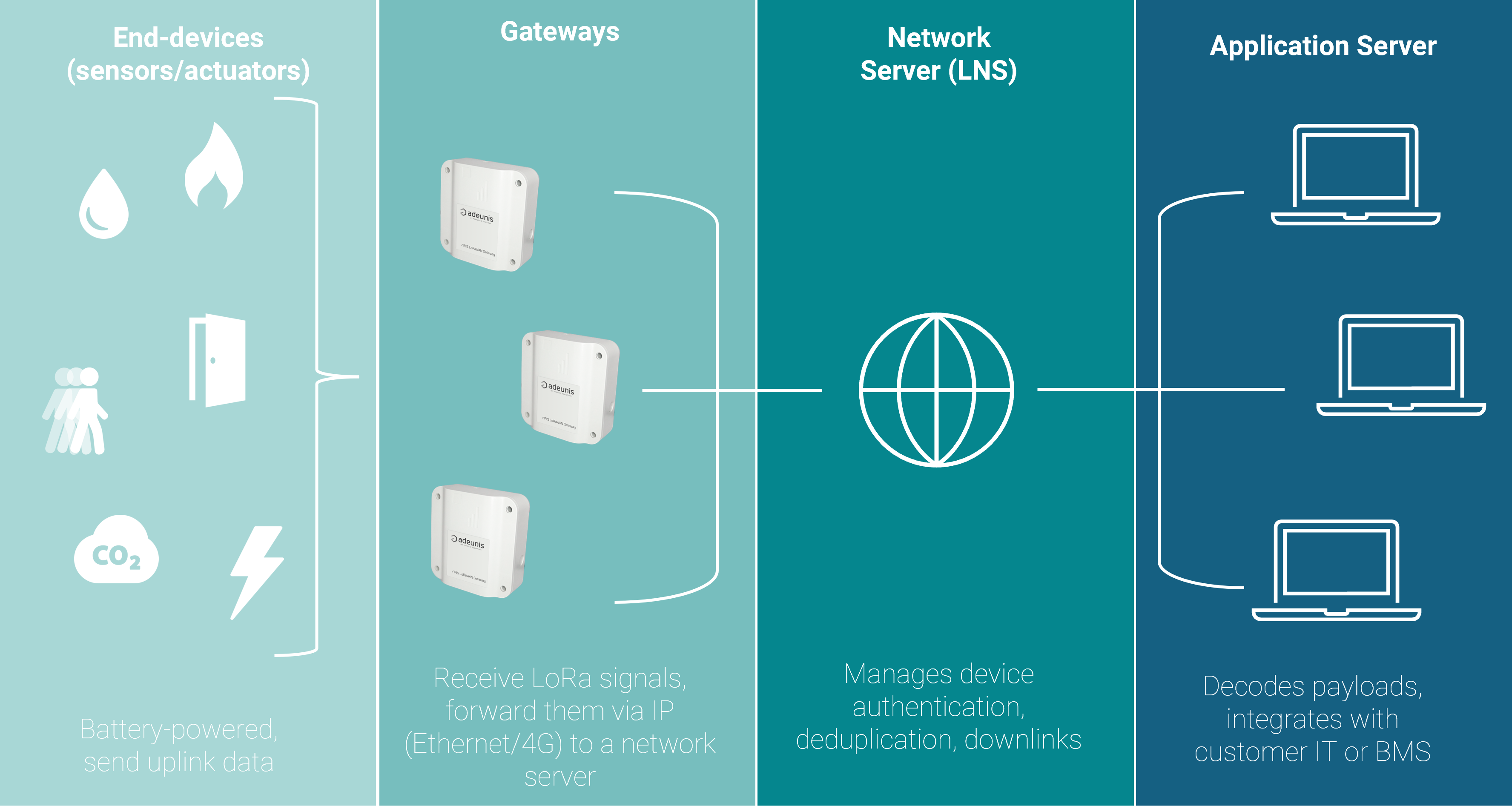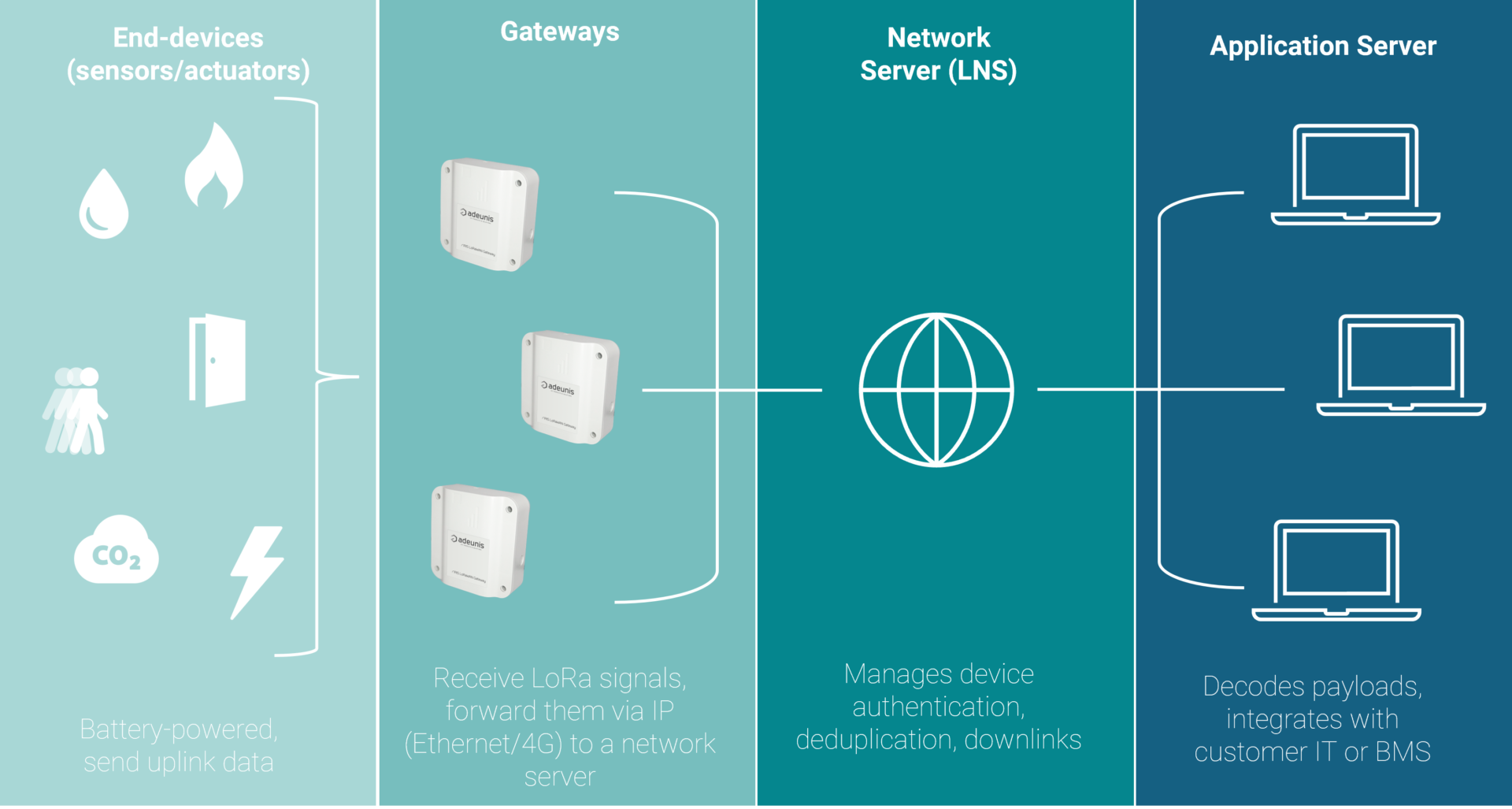 Sensors send their data via the LoRaWAN protocol (uplinks), either periodically or on specific events.